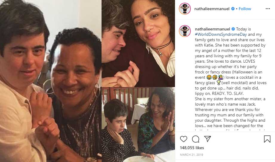 It’s hard to tell, whether Katie is blood-related to Natalie, or her mother has just adopted this girl. Nevertheless, Mrs. Emmanuel cares about her for almost a decade (as of 2020), and she is a part of the actress’s family. Katie has Down syndrome.